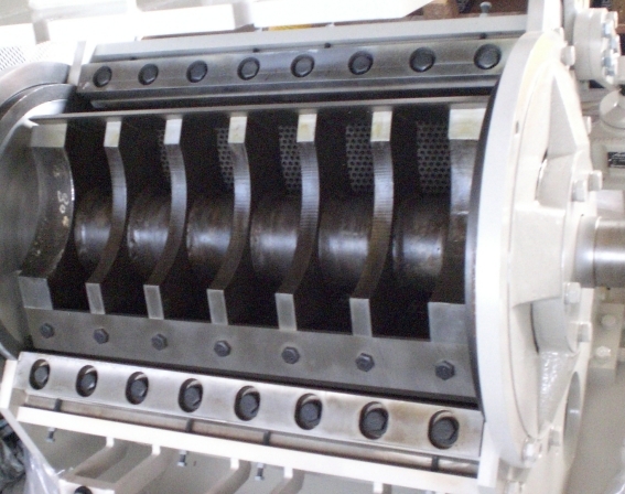Cutting chamber made entirely with parts fixed with bolts and pins, for a quick restoration of all construction components. Bearing support outside the cutting chamber to avoid any contamination from dust and liquids. Two fixed reversible blades, mounted on two seats with wear compensation device. All the internal surfaces of the cutting chamber are carefully machined with a high degree of finish to facilitate cleaning operations. Frontal adjustment system of the fixed blades “EasyAccess Cumberland”.
