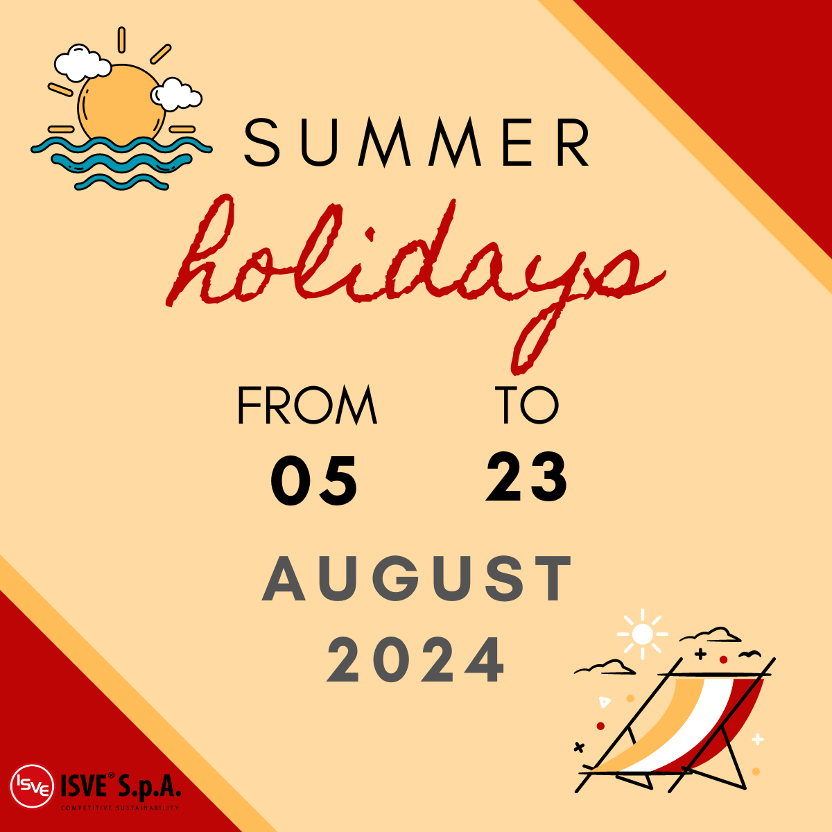 ISVE S.p.A. informs all customers and partners that the company will be closed for the usual summer break from 5 to 23 August 2024. During