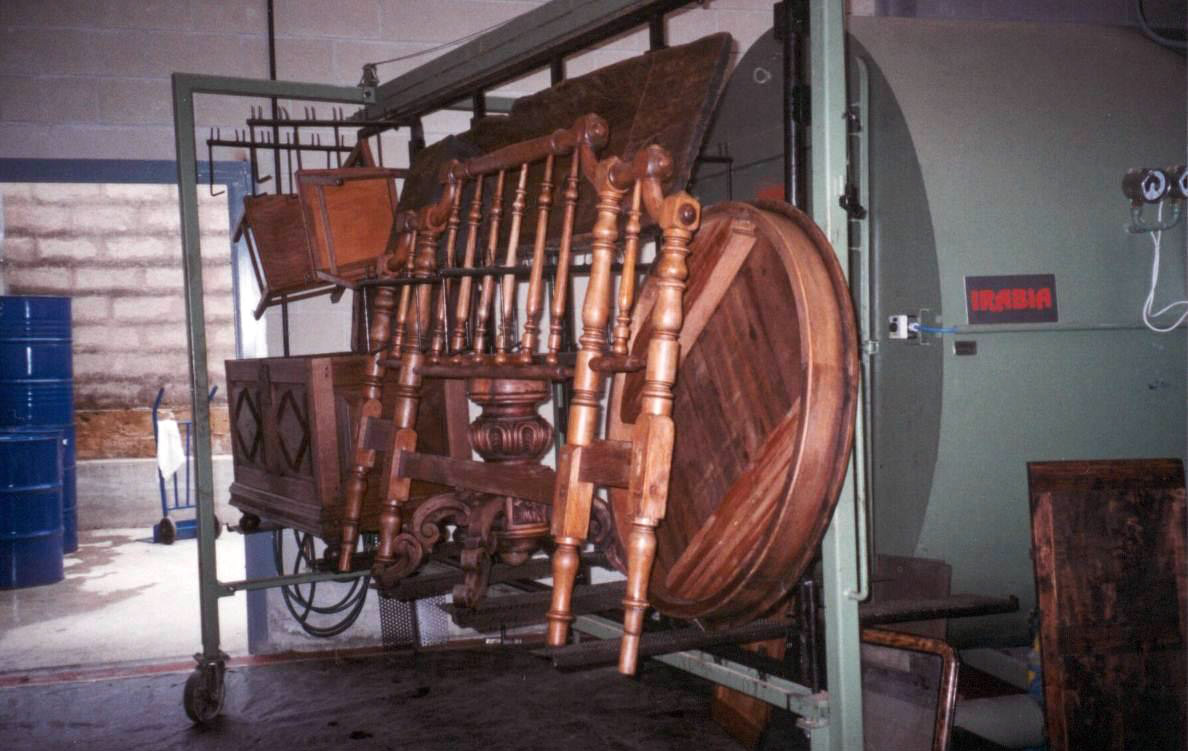 En esta fase, gracias a la acción combinada del vacío y a la nebulización del producto xilófago, se obtiene una penetración elevadísima del agente curativo que alcanza los intersticios más difíciles del mueble.
