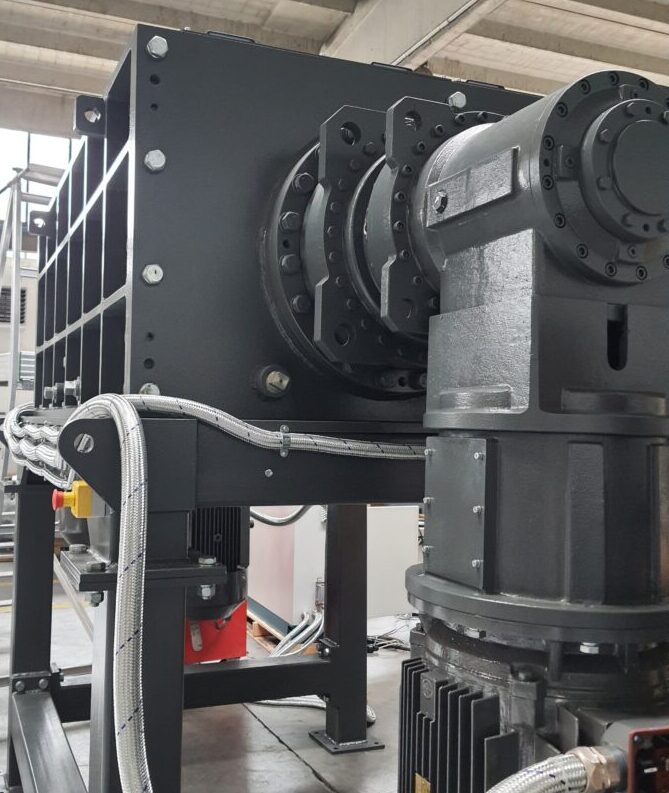 Ce broyeur est équipé de 4 motoréducteurs pour une puissance totale de 90 kW et développe un couple d’effort de coupe très élevé.
