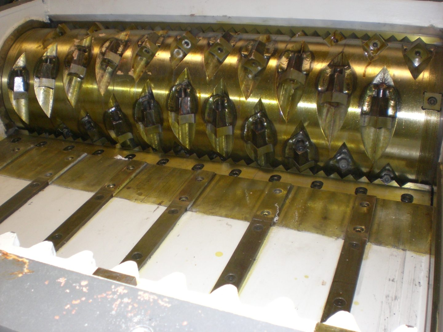 - Rotore di elevato spessore Ø400 mm lungo 1.100 mmm munito di nr. 66 placchette portautensili e nr. 66 utensili di acciaio altamente legato antiusura utilizzabili per quattro volte;