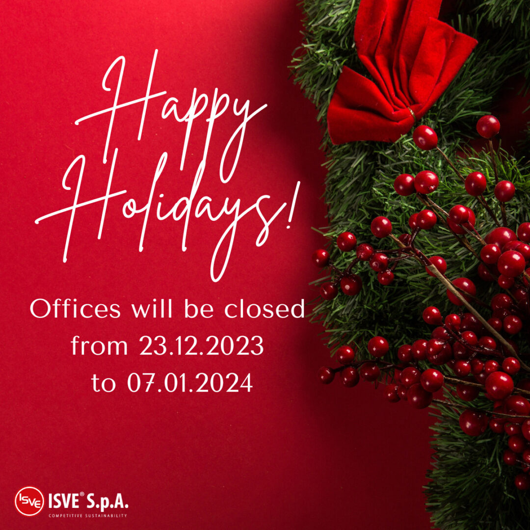 Informiamo tutti i nostri clienti e collaboratori che gli uffici di ISVE rimarranno chiusi per le festività natalizie dal 23 dicembre 2023 al 7 gennaio